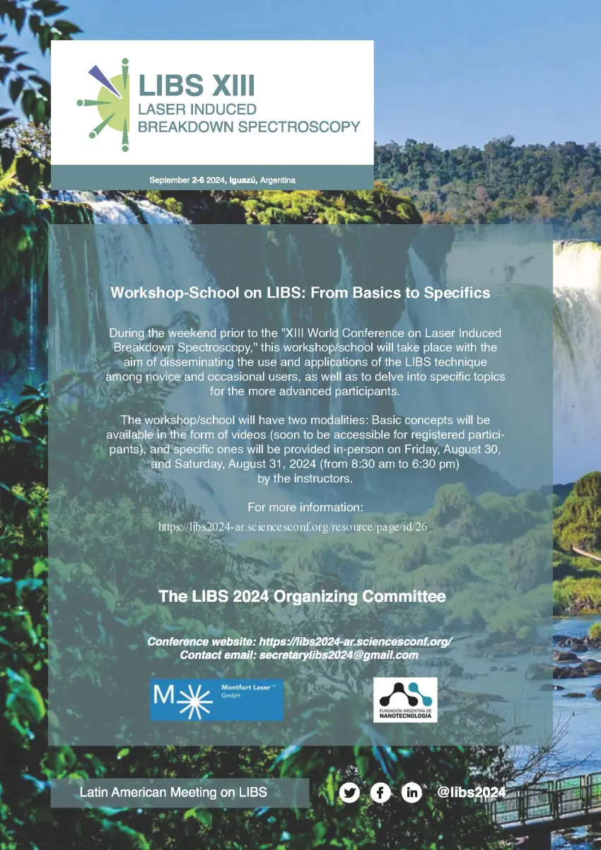 During the weekend prior to the «XIII World Conference on Laser Induced Breakdown Spectroscopy,» this workshop/school will take place with the aim of disseminating the use and applications of the LIBS technique among novice and occasional users, as well as to delve into specific topics for the more advanced participants. The workshop/school will have two modalities: Basic concepts will be available in the form of videos (soon to be accessible for registered participants), and specific ones will be provided in-person on Friday, August 30, and Saturday, August 31, 2024 (from 8:30 am to 6:30 pm) by the instructors.